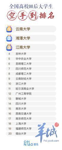 數(shù)據(jù)顯示,00后空手上學高校排名領先的省份是云南、江蘇、浙江、廣東和四川。這表明比起北方,南方大學生“空手到”功夫更好。