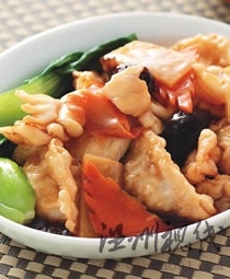 1.鯛魚片切小片狀;魷魚切花後再切小片狀;青江菜洗凈瀝乾對切;紅蘿卜切小片狀;蔥切段;姜切絲備用。