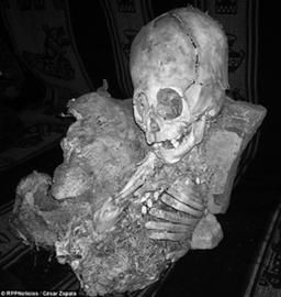 秘魯新出土木乃伊兩具,其中一個(gè)擁有奇大無(wú)比的頭顱,它有50厘米,長(zhǎng)度幾乎等同于它的身體,這令人類學(xué)家百思不得其解。據(jù)悉,如此詭異木乃伊的發(fā)現(xiàn)地是秘魯南部曲斯皮坎奇省的安德華利拉絲市。人類學(xué)家稱,它的眼眶遠(yuǎn)遠(yuǎn)大于正常人類。此外,這個(gè)奇怪頭骨的腦門尚未閉合,這是一歲以內(nèi)人類幼兒的獨(dú)有特征。但矛盾的是,它同時(shí)擁有兩顆大臼齒,這恰恰只存在于年齡稍大的人類。