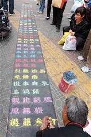 下午1時許,威海路與臺東八路交界的人行道上圍了很多人。“太不可思議了”、“字寫得真好啊”,人群中不時傳出贊嘆的聲音。人行道上鋪了一張長約10米寬約1米的地板革,上面寫滿了五顏六色的粉筆字。一名男子跪在地板革上,雙手緊緊夾住一小塊粉筆,在地板革上仔細地寫著字。