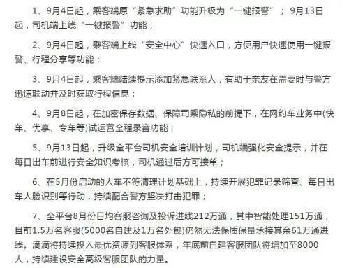 此外,滴滴出行啟動安全大整治,9月8日至15日暫停深夜服務,還推出包括將乘客端原“緊急求助”功能升級為“一鍵報警”、上線“安全中心”快速入口、方便用戶快速使用一鍵報警、行程分享等功能的七條整改措施。