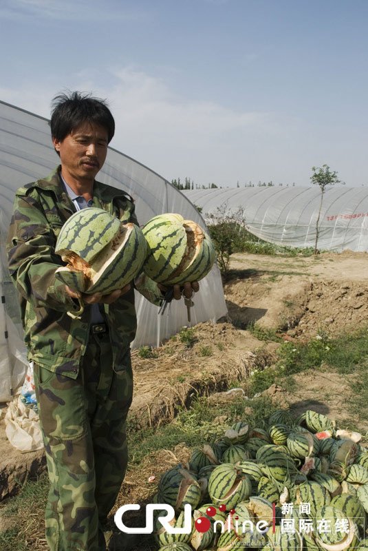 2011年5月13日,江蘇省鎮江市丹陽市延陵鎮大呂村,今年51歲劉明鎖種植的40多畝西瓜還沒有成熟就炸裂開來。