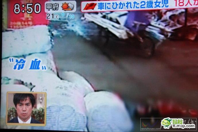 新聞節目的題目是“中國人無視被碾女孩” ,我拍下了一部分節目的畫面,從中可以看出日本人看待“小悅悅事件”的態度和視角。
