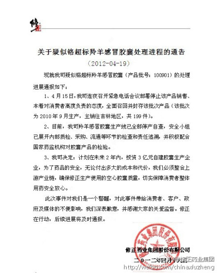 修正藥業稱,針對疑似鉻超標羚羊感冒膠囊(產品批號:100901),公司于4月15日連夜召開緊急電話會議部署停止該產品銷售,并全面召回并封存該批次產品(該批次為2010年9月生產,主銷往吉林地區,共199件)。