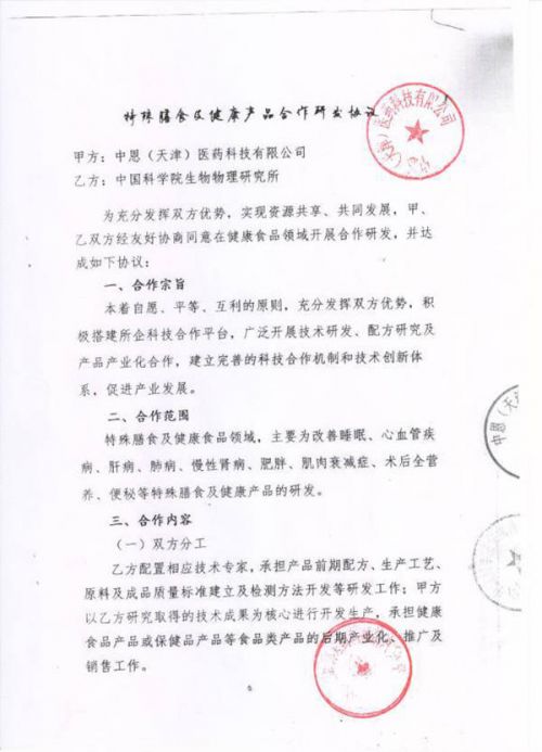 澎湃新聞記者看到的這份中科院生物物理研究所和中恩醫(yī)藥簽署的《特殊膳食及健康產(chǎn)品合作研發(fā)協(xié)議》中,雙方的合作范圍是“特殊膳食及健康領(lǐng)域,主要為改善睡眠、心血管疾病、肝病、肺病、慢性腎病、肥胖、肌肉衰減癥、術(shù)后全營養(yǎng)、便秘等特殊膳食及健康產(chǎn)品的研發(fā)”。
