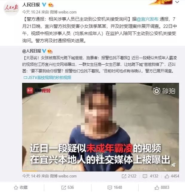 昨天下午@宜興警方通報,7月21日晚,宜興警方找到受害小女孩季某某,并及時受理案件展開調查。22日中午,視頻中相關涉事人員(均系未成年人)在監護人陪同下主動到公安機關接受詢問。警方將及時通報相關進展。