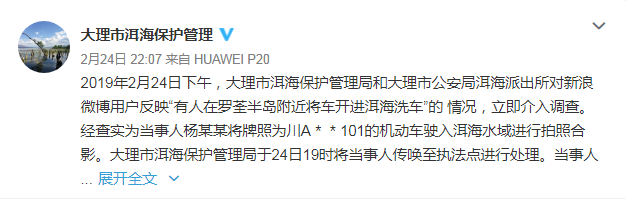 大理市洱海保護管理局官方微博稱,2019年2月24日下午,大理市洱海保護管理局和大理市公安局洱海派出所對新浪微博用戶反映“有人在羅荃半島附近將車開進洱海洗車”的情況,立即介入調查。經查實為當事人楊某某將牌照為川A**101的機動車駛入洱海水域進行拍照合影。大理市洱海保護管理局于24日19時將當事人傳喚至執法點進行處理。當事人對駕駛車輛進入洱海水域拍照的事實供認不諱。大理市洱海保護管理局依據《云南省大理白族自治州洱海保護管理條例》的規定,對當事人楊某某處以2000元的罰款。在此,呼吁廣大群眾,增強洱海保護意識,發現此類行為及時制止。