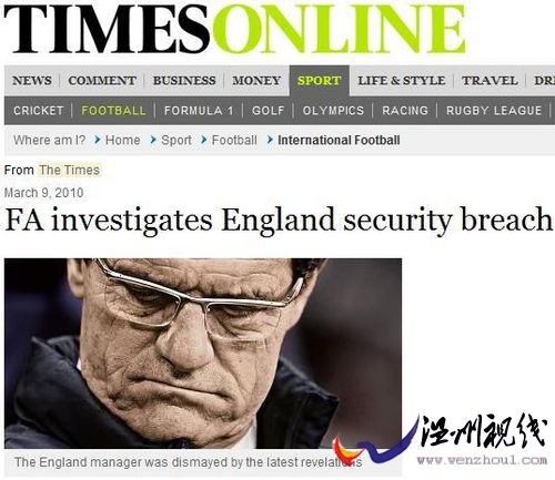 英國媒體《每日郵報》爆料,英格蘭國家隊主教練卡佩羅最近驚愕的發現英格蘭隊的世界杯準備工作遭到竊聽和錄音。該錄音涉及的全部都是英格蘭隊的戰術核心內容,如果這份竊聽錄音流傳出去的話,英格蘭隊在南非世界杯將前景堪憂。