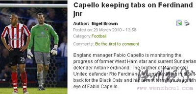 南非世界杯上,英格蘭國家隊可能出現費迪南德兄弟齊上陣的情況。一位安頓-費迪南德的密友透露,卡佩羅正在考察桑德蘭后場多面手安頓-費迪南德,在阿什利-科爾傷病情況難以預測,布里奇不愿回歸的前提下,安頓-費迪南德有望成為左后衛位置上的備選人物。