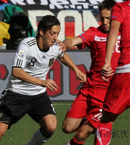 到了克洛澤兩張黃牌離場之后,厄齊爾的處境便更加尷尬。勒夫并未因主力中鋒的離場而做出戰術調整,被迫頂在最前面的厄齊爾甚至連傳球的目標都沒有了,我們只能看到身材瘦弱的厄齊爾一次次在高大的塞爾維亞后衛的緊逼下做出回傳,這大大限制了他的發揮。到了下半場,厄齊爾只有在退回到中圈附近的時候,才能夠從容的拿球,他送給波多爾斯基的那次長傳便是一例。