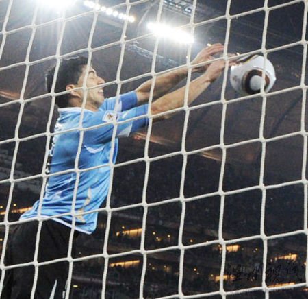 在烏拉圭與加納的八強戰中,蘇亞雷斯在門線用手拍出了加納人的射門,雖然他也因此被紅牌罰下,但對方的點球卻沒打進,雙方為此不得不通過點球決勝,而烏拉圭最后的取勝也讓蘇亞雷斯瞬間從罪臣變成功臣。