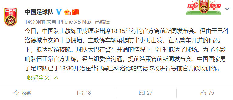 中國足球隊官方寫道:“今日,中國隊主教練里皮原定出席18:15舉行的官方賽前新聞發(fā)布會。但由于巴科洛德城市交通十分擁堵,主教練車輛雖提前半小時出發(fā),在無警車開道的情況下,抵達場館較晚。球隊大巴在警車開道的情況下已準時抵達了球場。為了不影響隊伍正常官方訓(xùn)練,經(jīng)與組委會溝通,提前結(jié)束賽前新聞發(fā)布會。中國國家男子足球隊已于18:30開始在菲律賓巴科洛德帕納德球場進行賽前官方踩場訓(xùn)練。”
