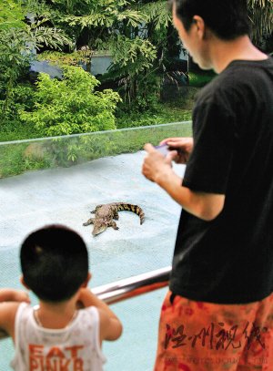 昨天,游客在溫州動物園觀看鱷魚。今年6月中旬,市綠眼睛救助中心將這條受傷的鱷魚送到市動物園,在市動物園精心救治下現已康復。 許日尤 攝