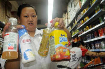 | 在世紀聯華南國店,工作人員在整理貨架時發現很多飲料被人偷喝,留下許多空瓶子。文廣 攝 |