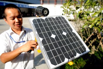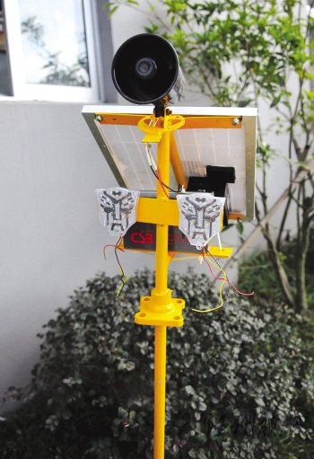 永嘉青年李賢義在永嘉甌北閥門廠上班,他的新發明了——“太陽能全自動聲光驅獸器”,正面是兩個會發光的"變形金剛"LED燈,上頭還有一個黑乎乎的喇叭,中間兩個小方盒,背面則是一個黑白相間的太陽能板。