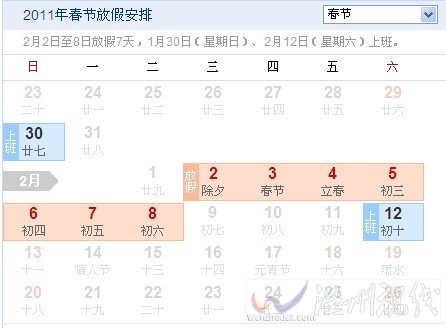 溫州日報 根據《國務院辦公廳關于2011部分節假日安排的通知》(國辦發明電〔2010〕40號)規定,2011年春節放假時間為2月2日(農歷除夕)至8日(正月初六),共7天。1月30日(星期日)、2月12日(星期六)上班(圖中紅色為假日,藍色為工作日)。