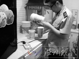 昨天中午,根據(jù)記者反映的情況,鹿城區(qū)江濱工商所工作人員來到新時代電影大世界一樓“時光咖啡”爆米花銷售點,扣留了該店830個同一廠家生產(chǎn)的爆米花桶,并約談了該店負責人。