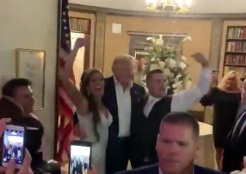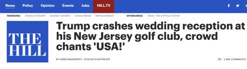 特朗普闖婚宴現(xiàn)場:據(jù)《國會山報》報道,當?shù)貢r間20日晚,美國總統(tǒng)特朗普意外現(xiàn)身位于美國新澤西州高爾夫俱樂部的婚宴現(xiàn)場。原來,這是特朗普名下的高爾夫俱樂部,他自己的產(chǎn)業(yè)。視頻顯示,當特朗普走進參加婚宴現(xiàn)場后,新郎和新娘沖上前去擁抱特朗普,并高喊“美國!”,賓客們也高唱愛國歌曲。