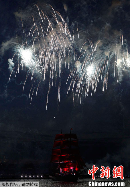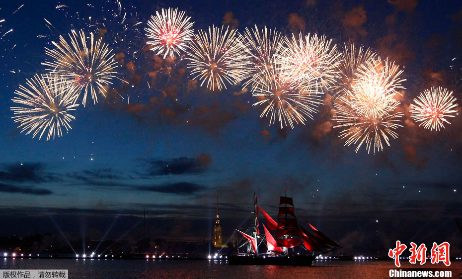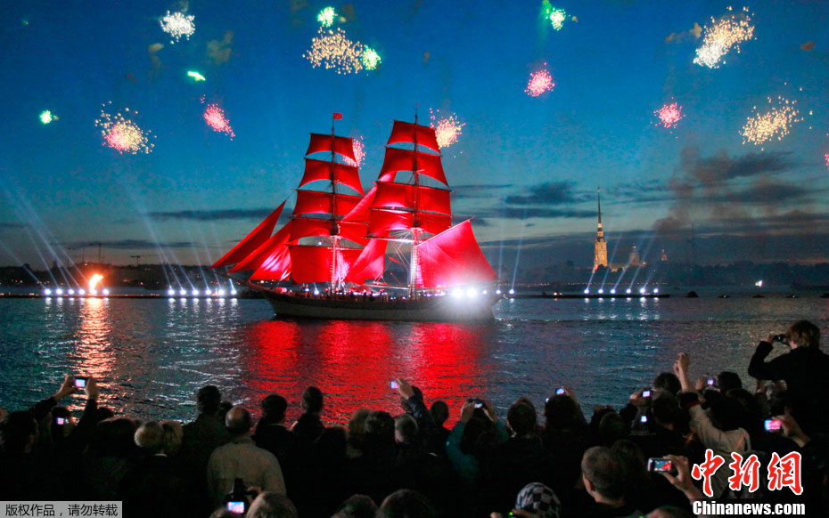 圣彼得堡紅帆節煙花燦爛精美圖片。2011年6月19日,俄羅斯圣彼得堡涅瓦河畔,人們參加“紅帆節”,觀看煙花表演。“紅帆節”是一年一度的慶祝中學畢業生的節日。每年夏至白晝前最后一個周五的夜晚,圣彼得堡都會舉辦“紅帆節”,俄羅斯紅帆節是為了讓所有的中學畢業生告別少年,在黎明來臨之際迎接人生新的階段。圣彼得堡紅帆節真是浪漫的節日,一個多么朝陽和美好回憶的節日,煙花燦爛,紅帆象征著生命旅途一帆風順,很美,很詩意的節日。