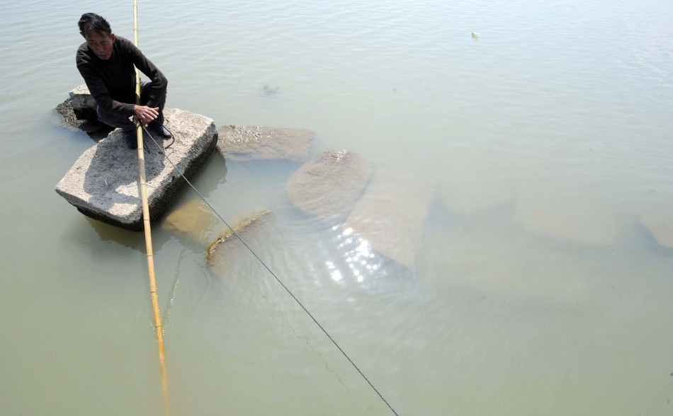 盱眙明祖陵圖片朱元璋祖陵,5月27日,盱眙明祖陵景區的一名工作人員在察看城墻出水情況。近日,地處淮河下游的江蘇省盱眙縣遭遇罕見旱情,導致淮河水位大幅下降。盱眙大旱導致明祖陵城墻露出水面。