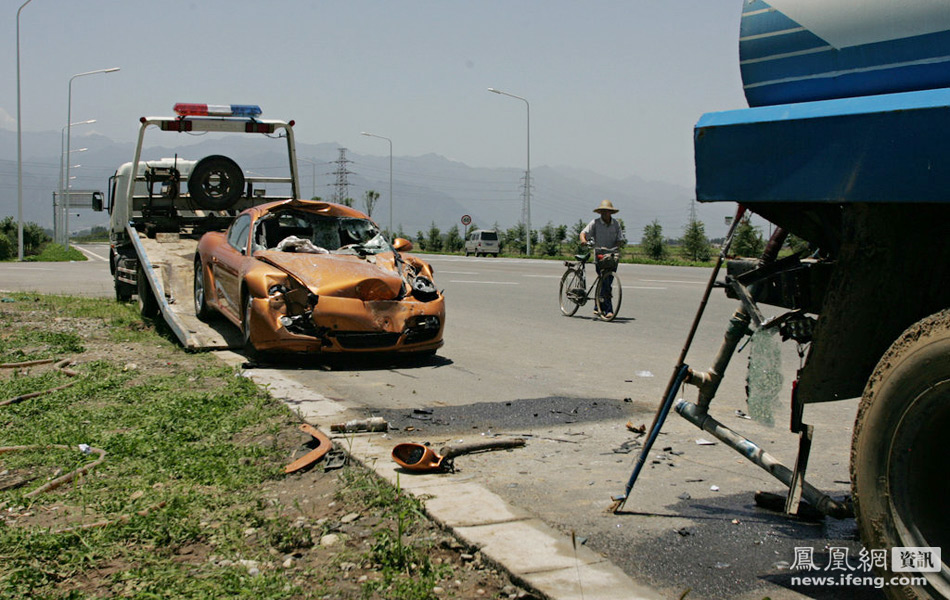 西安跑車裝上灑水車 安全氣囊保不住跑車上兩人性命