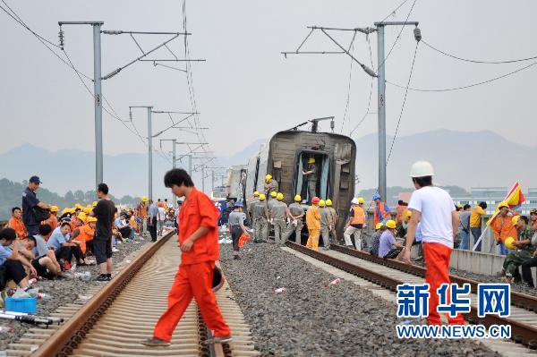 事故現場圖片:7月23日20時27分,北京至福州的D301次列車行駛至溫州市雙嶼路段時,與杭州開往福州的D3115次列車發生追尾事故。截至24日凌晨2時30分,7月23日晚溫州境內發生動車追尾已有191名傷員送至當地醫院救治,死亡34人。7月24日,救援人員和施工人員在清理事故現場。新華社記者 鞠煥宗