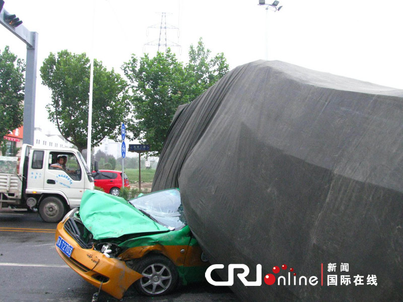 西安出租車和大貨車相撞,無人員傷亡。2011年8月3日上午,一輛滿載方便面的大貨車剛出廠行至鳳城二路與明光路十字時,突然與一輛由北向南的出租車相撞,大貨車側(cè)翻將出租車壓在車下,大貨車壓在西安出租車上滑出5米遠,雙方司機所幸均無傷亡,真是萬幸。圖片來源:CFP