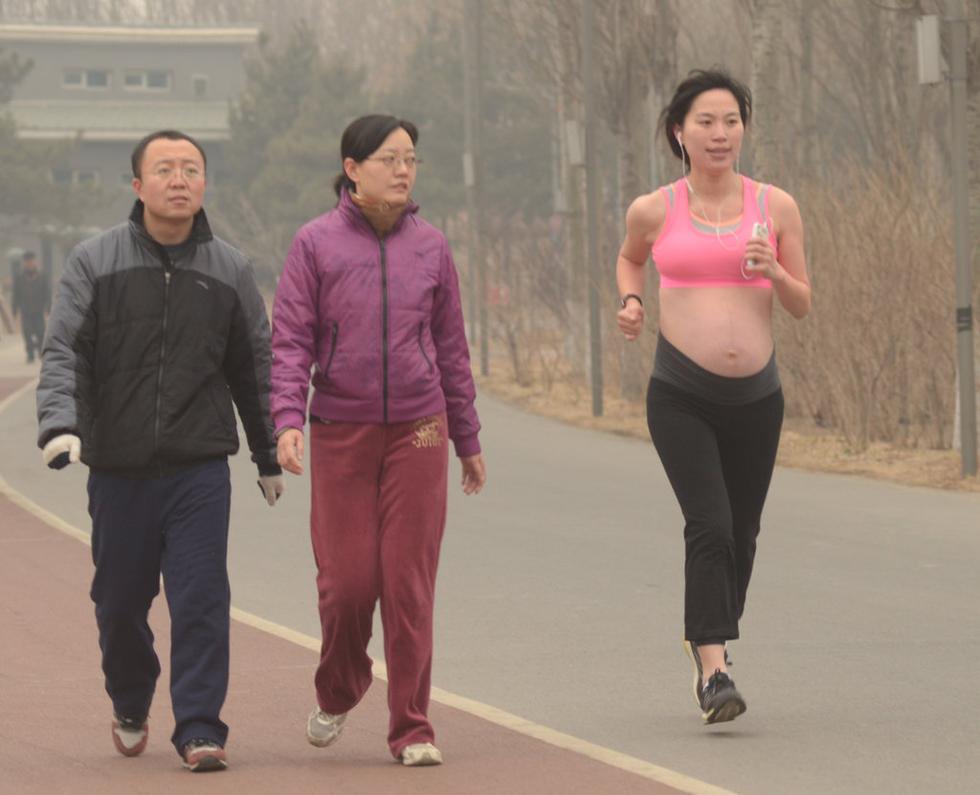 孕婦霧霾中奔跑 2014年2月23日北京孕婦穿清涼裝跑步