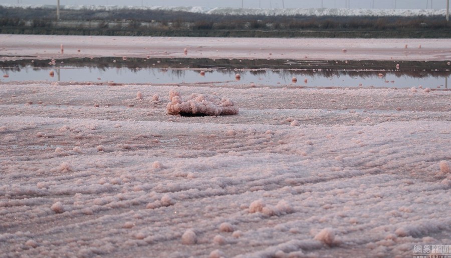 中國死海變玫瑰湖:2017年1月11日,山西運城古老的鹽湖變成了玫瑰湖,由于低溫干涸的湖底出現晶瑩剔透的“硝花”現象,粉色硝花像開滿了玫瑰。
