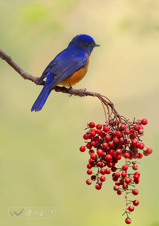 攝影作品,金秋時(shí)節(jié)山里的野果成熟了,紅澄澄的山桐子色彩飽滿,看著鮮艷欲滴,引來(lái)黃腹琉璃采食。黃腹琉璃鳥(niǎo)的腹部羽毛金黃色,背和尾部羽毛是純凈飽和如藍(lán)寶石一樣的深藍(lán)色。飛羽和野果濃重飽滿的色彩,鳥(niǎo)兒采食的歡快喜悅,點(diǎn)綴著山里金秋的美麗