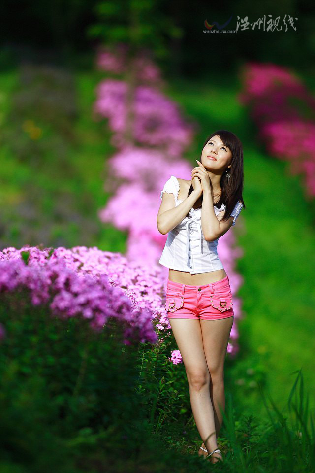 黃美姬英文名字Hwang Mi Hee粉紅色短褲本已經(jīng)夠誘惑了,而且在公園的粉紅色花壇前面,真是整個畫面粉紅色沖擊力太強了,熱褲下面是裸露的美腿,沒有穿絲襪的黃美姬寫真,把粉紅色的誘惑再次升溫,柔柔美美的感覺很舒服。