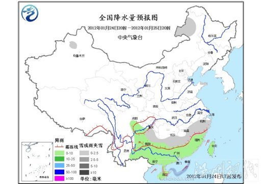 24日20時至25日20時,內蒙古東北部的部分地區、山東半島東北部、江南南部和東部、貴州北部等地有小雪或雨夾雪,其中,貴州中西部、湖南南部等地的部分地區有凍雨;四川盆地南部、云南東部、華南、臺灣等地有小雨或陣雨;臺灣海峽有6~7級、陣風8級的東北風。