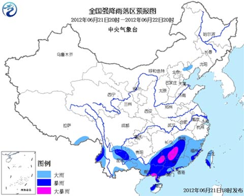 6月21日18時中央氣象部門發布的全國強降雨落區預報圖