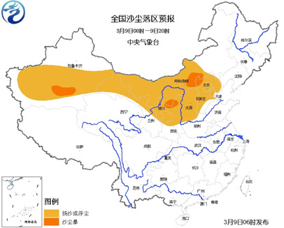 9日08時至9日20時,南疆盆地、甘肅中西部、內(nèi)蒙古中西部、陜西中北部、寧夏、山西、河北中北部、京津等地有揚沙或浮塵天氣,其中,南疆盆地東部、內(nèi)蒙古中西部局地有沙塵暴。