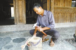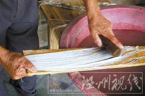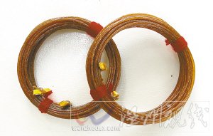 琴弦制作 牛筋弦整個生產過程主要有24道工序:取本地健壯黃牛背上牛排筋;剔除牛排筋上的肉;把牛筋放在砧板上敲捶;把牛筋上肉末泡洗干凈;溶入配方和適量堿粉等;沖洗干凈,去掉牛筋上的油質;晾干;把粗牛筋分瓣成一根根牛筋絲;把牛筋絲分成長條絲和短條絲;把牛筋絲粗細拉勻;以長絲為主線、短絲為副線揉搓成粗線條;綁在柱子上拉緊;定型后再拉成直線;用剃刀把牛筋線上的毛頭、小結剃刮干凈;取黃枝果煎成黃色堿水;取黃魚鮫和黃枝果水浸泡牛筋線;浸泡10個小時后,取出洗凈,再晾干;上釉和修坯;再次綁在柱子上絞緊;晾干水分,以防收縮;逐段嚴格查驗,若發現毛結,再作加工;完工后即成牛筋弦,每根牛筋弦長3丈6尺,卷成一卷;在每根牛筋弦頭尾打上出品印記,裝進盒子,貼上標簽和牌號。每道工序看似簡單,然而都不可或缺。幾百年來牛筋弦制作技藝靠口傳心授得以世代相傳,要憑悟性和長期實踐體會才能掌握,難于言表和形成詳細文字。