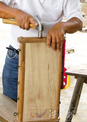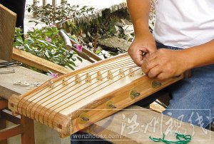 琴架制作 選取直徑70厘米以上無疤痕的梧桐板,鋸成2厘米厚的弧形薄板兩塊,一塊為面板,一塊為底板,水中浸泡若干天后,晾干刨平;取紅硬木為琴邊框架;框架兩頭擰上螺絲釘;上琴弦;最后在琴板和每條琴弦之間安一個竹碼作填子,用于調節校音。琴架制作完成后,牛筋琴已基本成形,不過制作師傅還要對牛筋琴進行修整和調音,確保質量過關。此項工藝要求極高,制作師傅不僅要會圓木制作技藝,而且必須對溫州鼓詞的樂曲常識和牛筋琴的發音特點了如指掌。