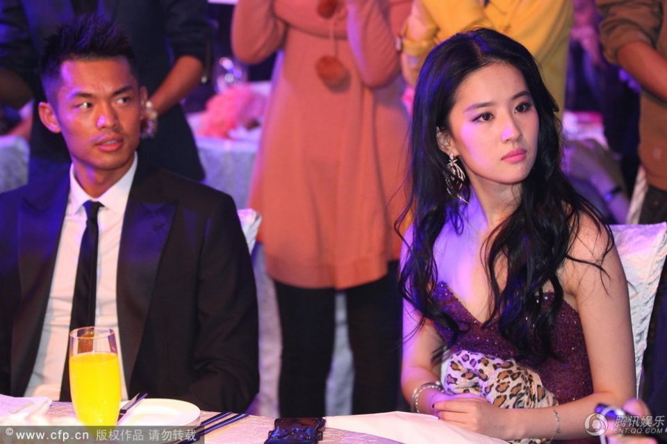 劉亦菲與林丹握手 劉亦菲紫色深V禮服照片