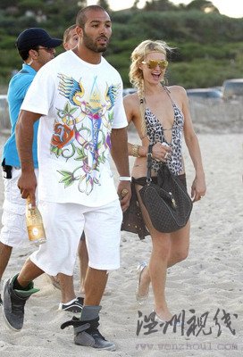 希爾頓穿性感豹紋泳裝 與五猛男海灘游玩